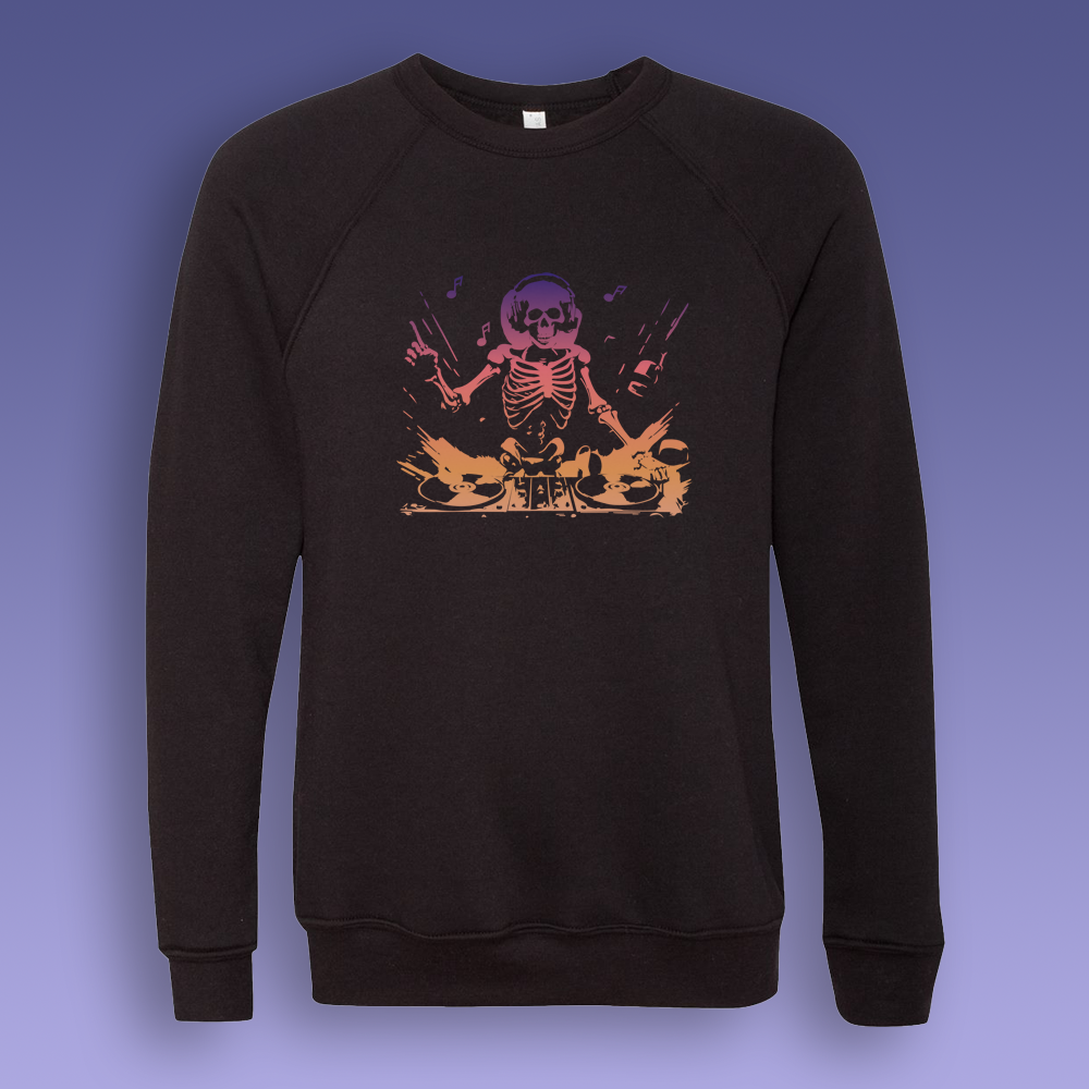 Details: 52/48 airlume combed and ring-spun cotton /polyester. Unisex sizing with a relaxed fit. Crewneck, drop shoulder, mid-weight sweatshirt. Image includes skeleton family graphic in front of a haunted house.